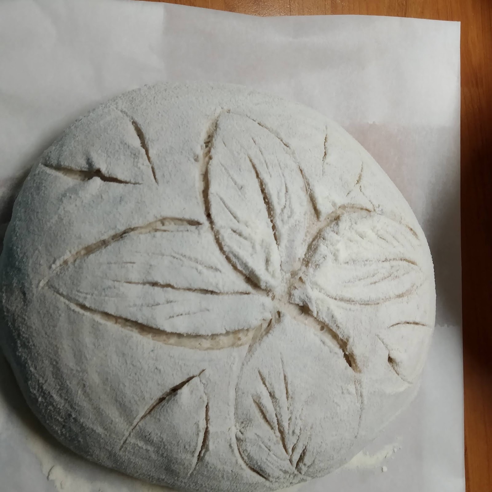Po kynoucí fázi si těsto vyklopíme na lehce pomoučněný vál. Někdo si dává na mokrý. Záleží na každém, co mu vyhovuje. Těsto teď několikrát přeložíme jako prádlo. Na půl a na půl a na půl.....já si při tom těsto vždy zvednu do vzduchu, aby se svoji tíhou natáhlo. Po několika přeložení, již to jde hůř. Tím se chleba utahuje, aby neměl veliké díry ve střídce. Pak si těsto stočíme do ošatky spojem nahoru. Množství je na ošatku na 1 kg. Já teď dávala do dvou o obsahu na 0,5 kg. Ošatky si důkladně vysypeme moukou. Dávám polohrubou. Vetřít se musí hlavně do mezer. Ošatku nevyklepávat.